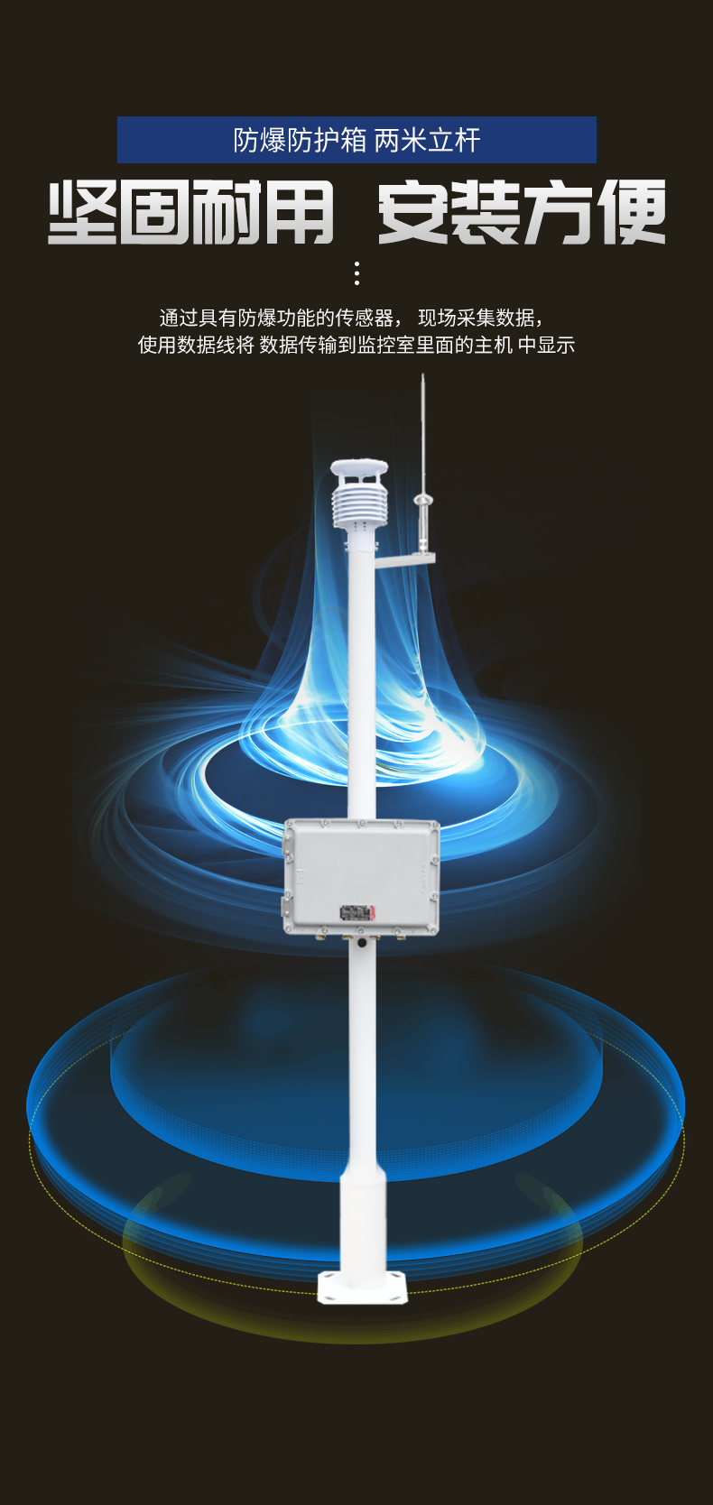 此款防爆氣象站采用了防腐、防爆、防水、防震、防塵等高防護(hù)等級(jí)的設(shè)計(jì)理念,可滿足化工廠、油庫(kù)、隧道、礦井等場(chǎng)景的使用需求。